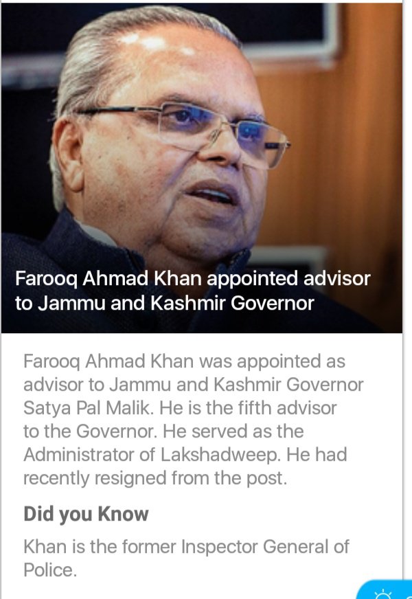 Farooq Ahmad Khan appointed advisor to Jammu and Kashmir Governor.